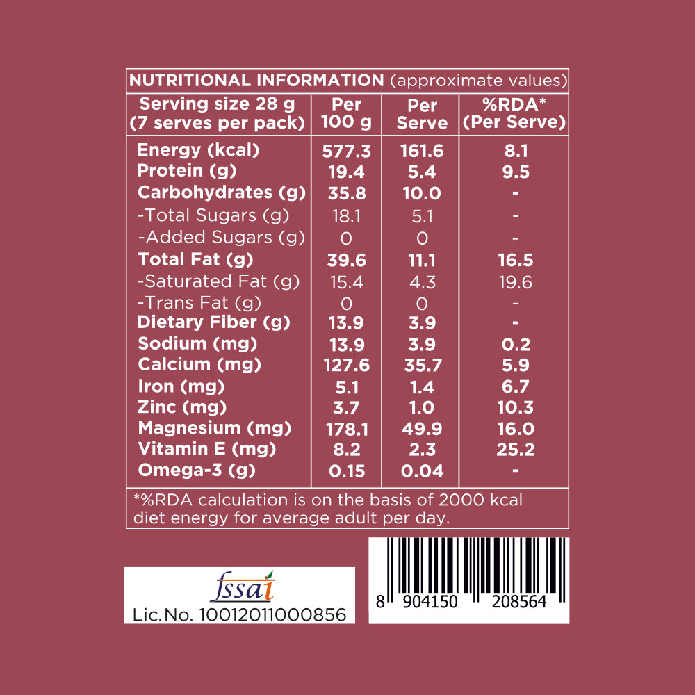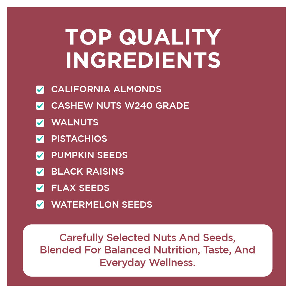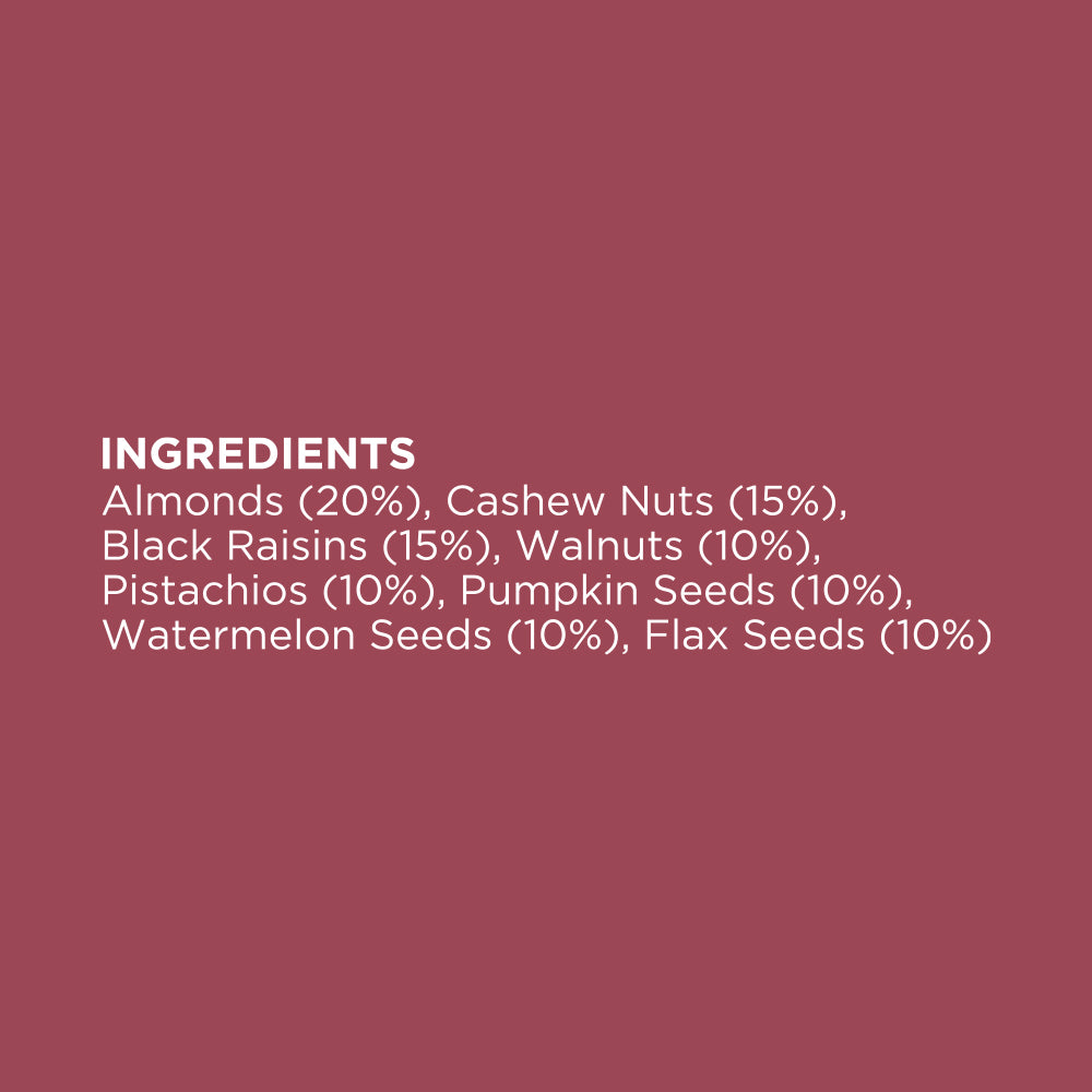 - INGREDIENTS: Almonds, Cashew Nuts, Black Raisin, Walnut, Pistachios, Pumpkin Seeds, Flax seeds, Watermelon seeds