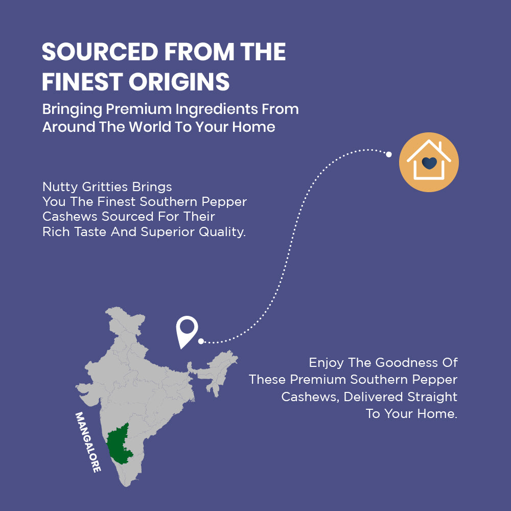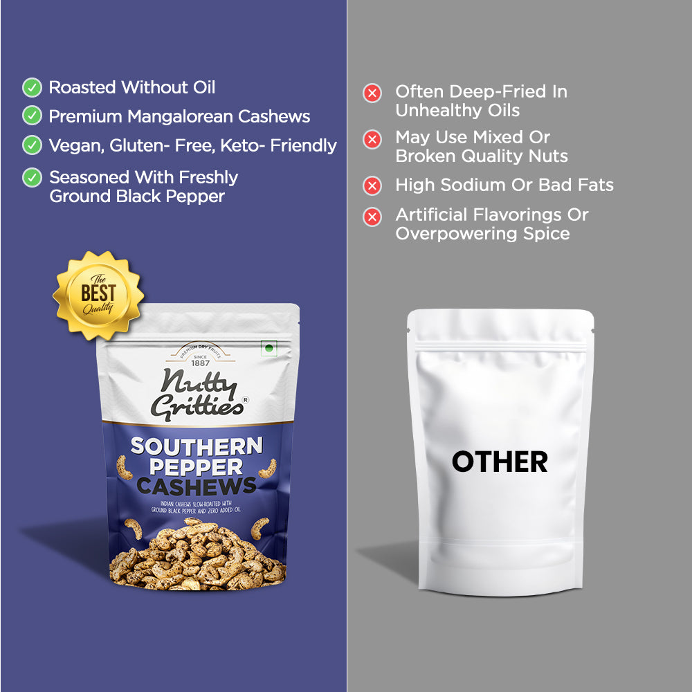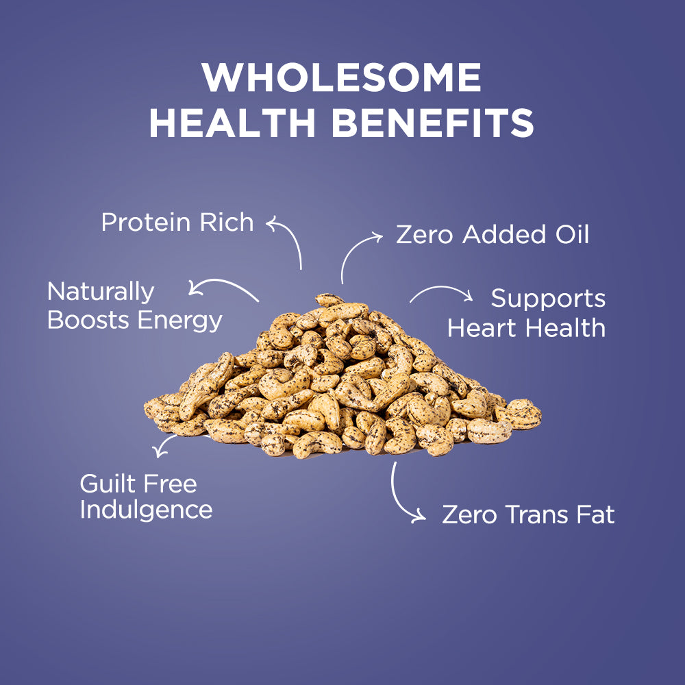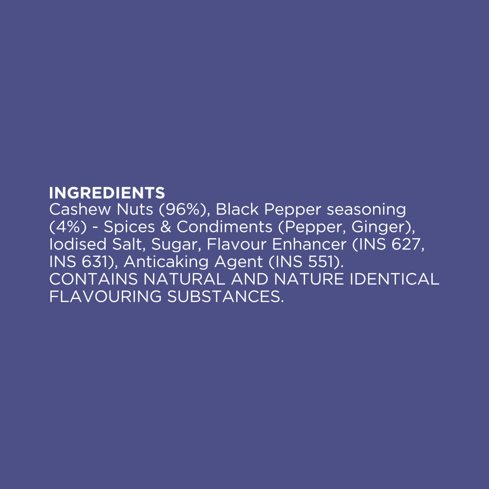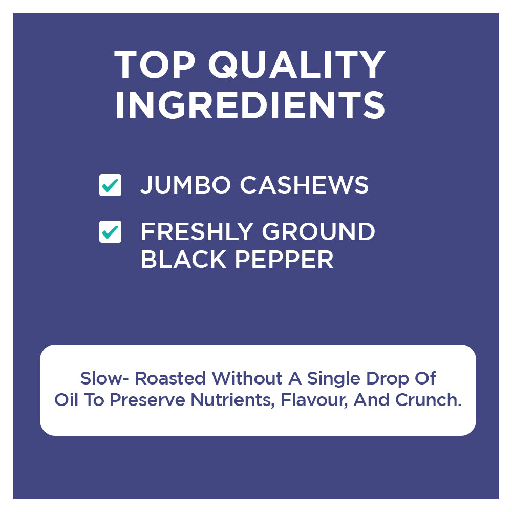 - Mangalorean Cashews roasted without a single drop of oil in freshly ground black pepper