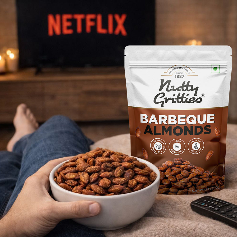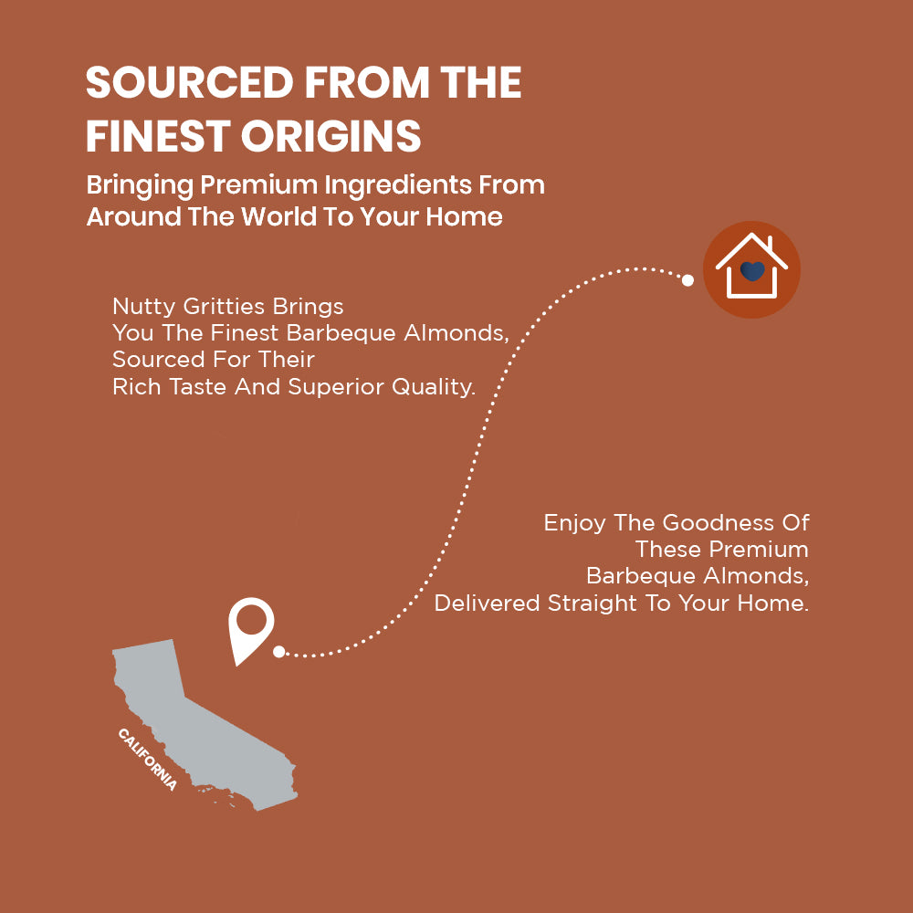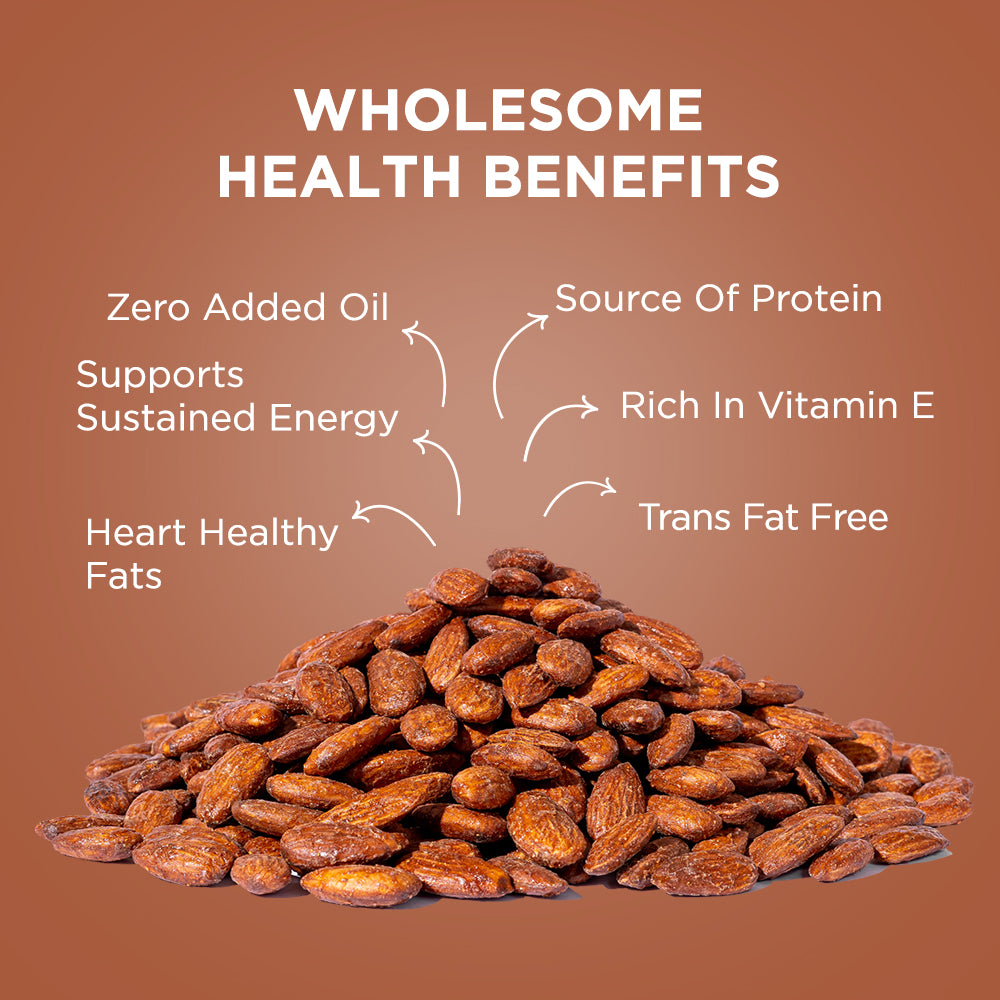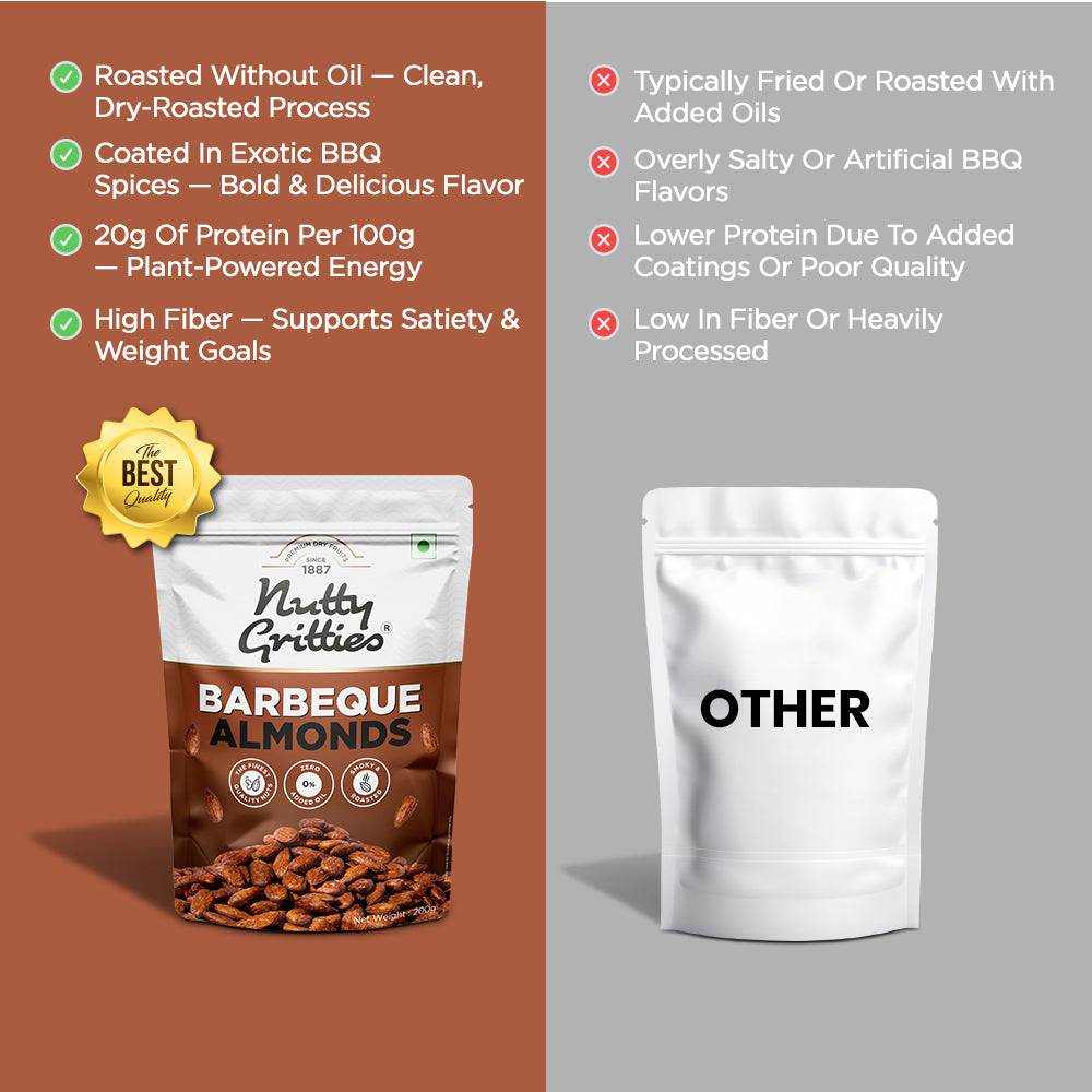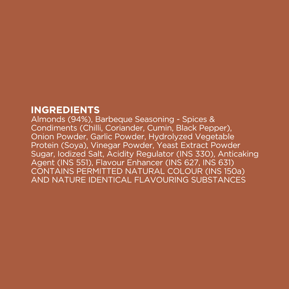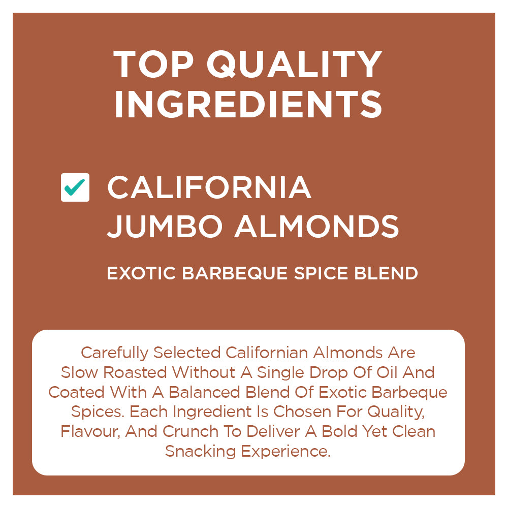 - Californian almonds that are roasted without a single drop of oil in exotic Barbeque Spices.